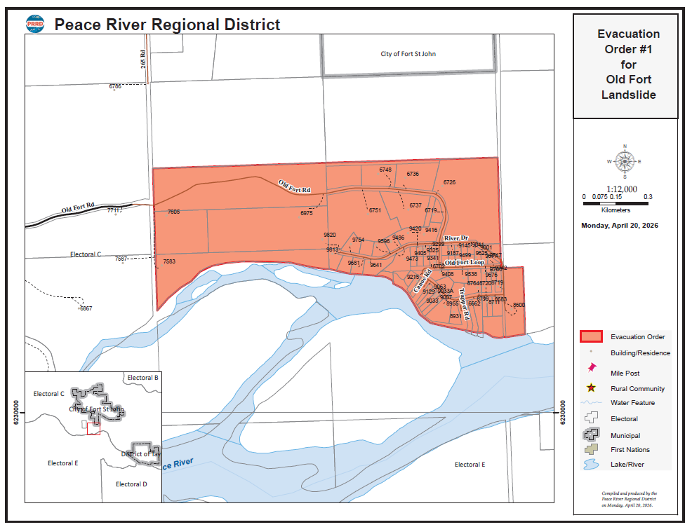 The Peace River Regional District has issued an Evacuation Order for the Old Fort area due to landslide. This landslide is creating a significant risk to life. The coordinated evacuation access period on Monday night has now ended.