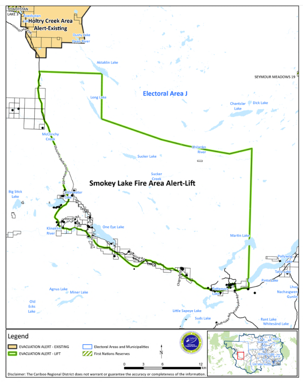 The Cariboo Regional District has rescinded an Evacuation Alert for the Smokey Lake area due to wildfire. The threat to life and safety has passed.