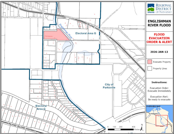 The Regional District of Nanaimo has RESCINDED an Evacuation Alert for 58 properties in Electoral Area G due to flooding on the Englishman River. The risk has passed. NOTE: as of 1:00PM, January 13, Nanaimo Regional District has also RESCINDED the Evacuation Order for 380 Martindale Rd. (Pathfinder Camp Resorts).
