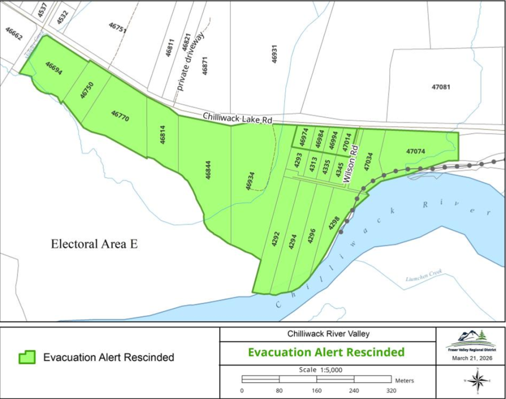 The Fraser Valley Regional District has RESCINDED the Evacuation Alert for properties in the Wilson Road area. Stay away from swift-running rivers and unstable banks. Due to the soil saturation, expect possible erosion and debris slides.