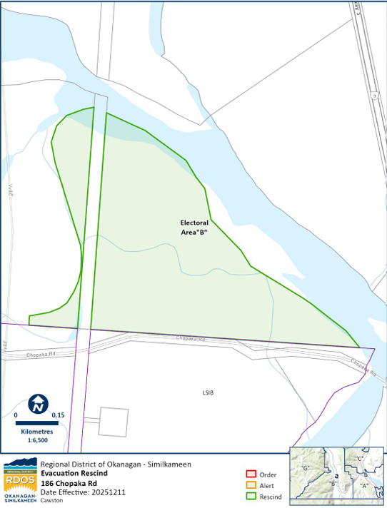 The Regional District of Okanagan-Similkameen has RESCINDED the Evacuation Order for Chopaka located within Electoral Area “B”. Impacted residents are able to return home.