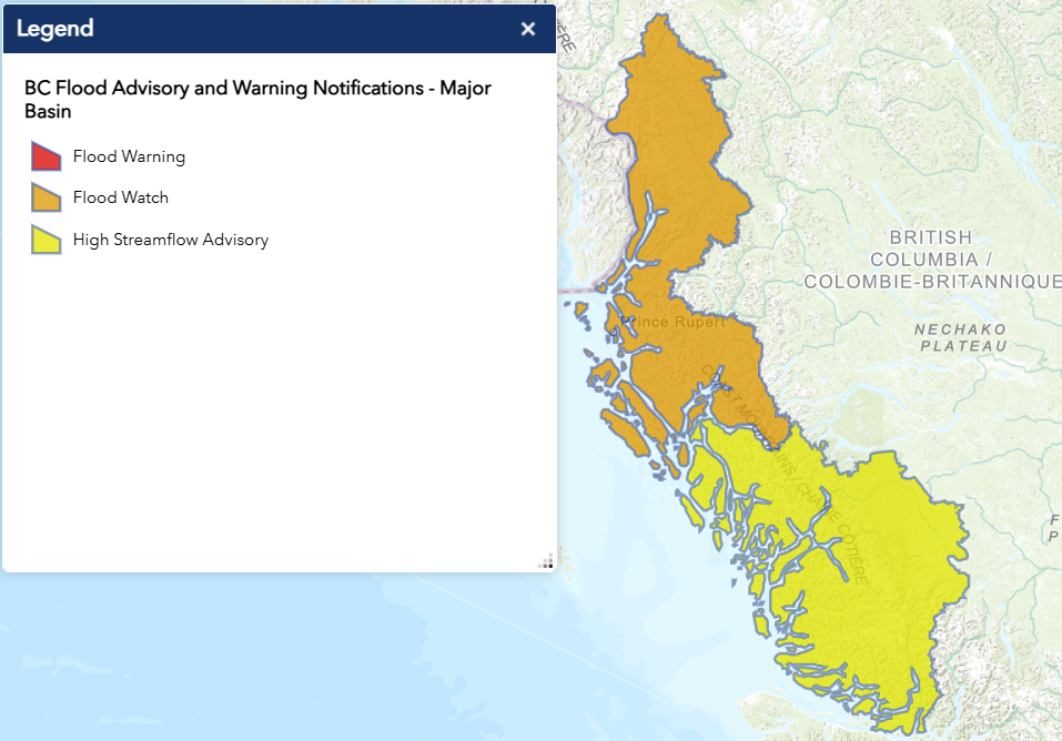 The River Forecast Centre has upgraded a High Streamflow Advisory to a Flood Watch for the North Coast including tributaries along the outer coast and inland areas including Prince Rupert, Kitimat, Terrace and surrounding areas.