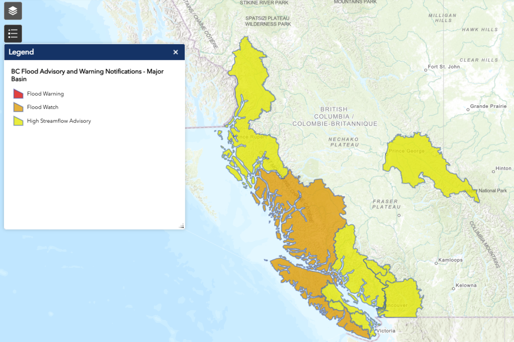 A Flood Watch (orange) has been issued by the River Forecast Centre. Check the River Forecast Centre’s website for latest Flood Advisories in B.C.