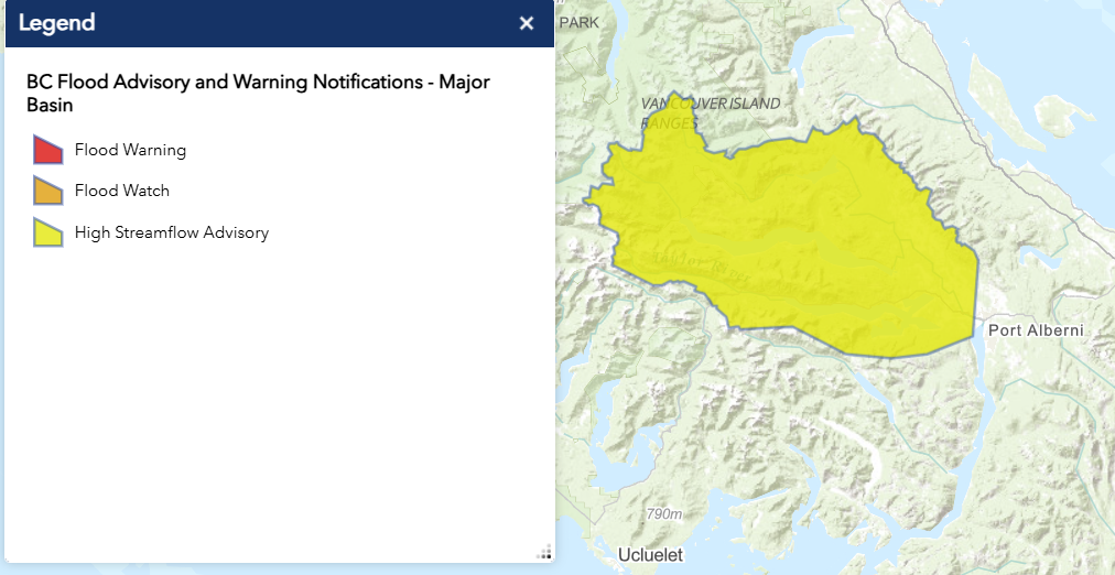 The River Forecast Centre has downgraded a Flood Watch to a High Streamflow Advisory for Somass River. The public is advised to stay clear of these fast-flowing rivers.
