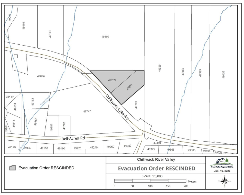 The Fraser Valley Regional District has rescinded an Evacuation Order issued for two properties in Electoral Area E (49269 and 49279 Chilliwack Lake Road) due to landslide risk.