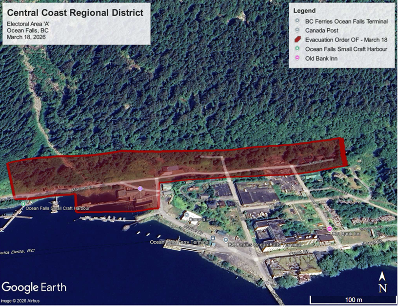 The Central Coast Regional District has issued an Evacuation Order for the hamlet of Ocean Falls in Electoral Area A, British Columbia due to landslide hazard risk. Impacted people must leave immediately.