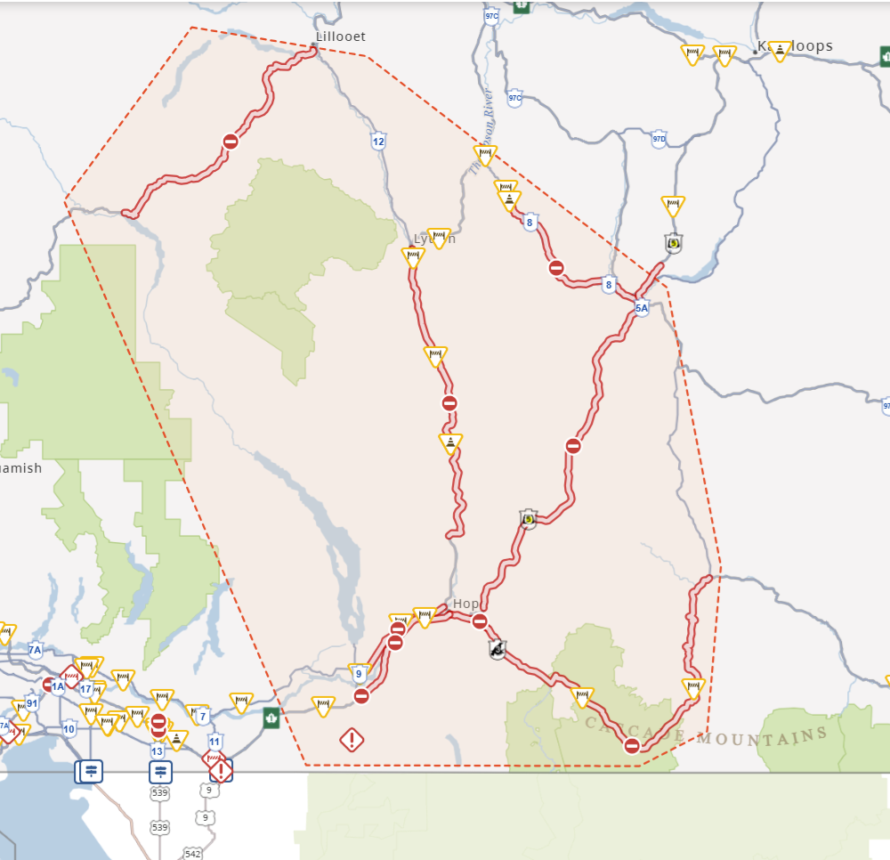 Additionally, the Ministry of Transportation and Transit has closed major highways between the Lower Mainland and the Interior due to flooding, falling rock and debris, and high avalanche hazards. Current closures include: