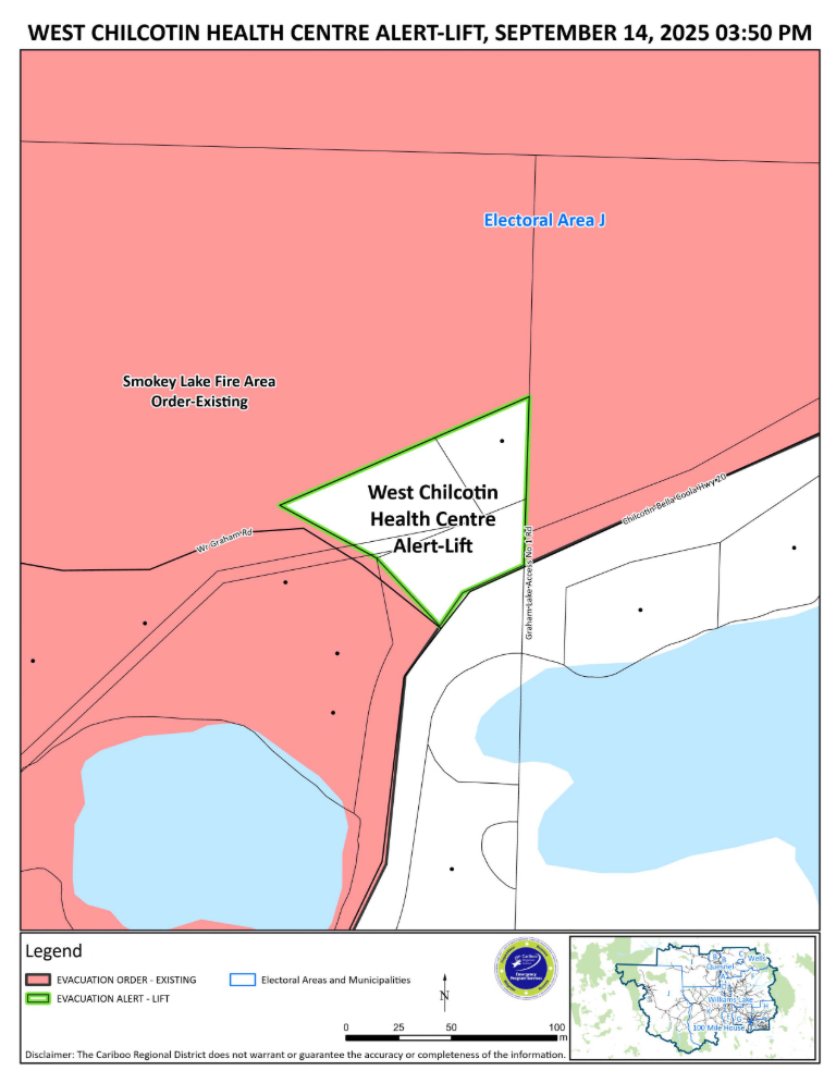 The Cariboo Regional District has rescinded the Evacuation Alert issued for the West Chilcotin Health Centre due to wildfire.