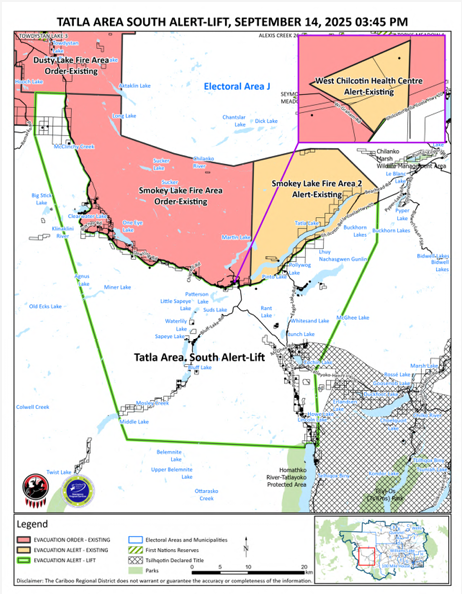 The Tŝilhqot’in Nation and Cariboo Regional District have rescinded an Evacuation Alert for Tatla Area South due to wildfire.