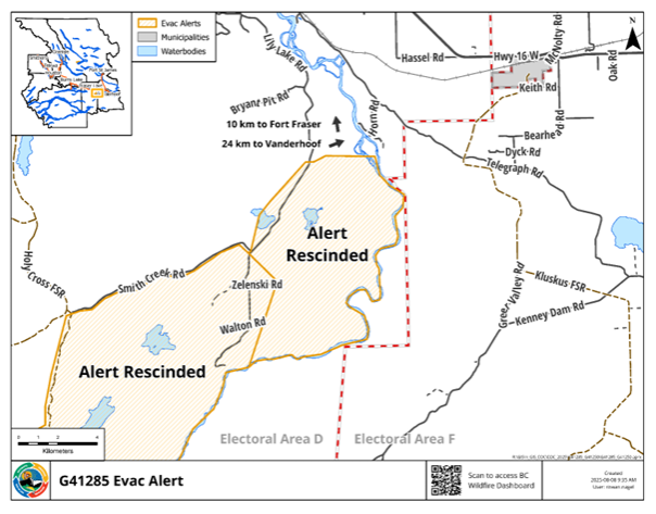 The Regional District of Bulkley-Nechako has rescinded an Evacuation Alert for an area located between Holy Cross Hallet Lake FSR and Lily Lake Road, south of Smith Creek Road and north-west of the Nechako River, due to wildfire. The threat to life and safety has passed.
