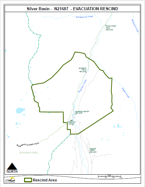 The Regional District of East Kootenay has rescinded an Evacuation Alert for multiple properties in the Silver Basin area near Bugaboo Provincial Park. The threat to life and safety has passed.