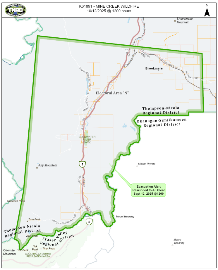 The Thompson-Nicola Regional District has rescinded an Evacuation Alert issued for multiple addresses in Electoral Area “N” due to the Mine Creek wildfire.